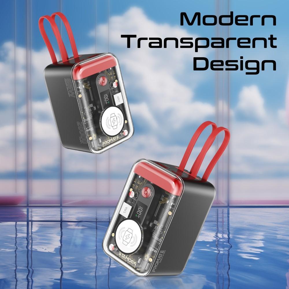 أفضل بطارية متنقلة 5 في 1، شاحن عالمي بسعة 20000 مللي أمبير مع كابلات USB-C ولايتنينغ مدمجة، منفذ توصيل للطاقة USB-C بقدرة 65 واط، منفذ USB-A بقدرة 27 واط وشاحن ساعة آبل بقوة 3 واط بتصميم شفاف وشاشة LED مع نظام أمان متعدد الحماية - Promate Mavrix-20